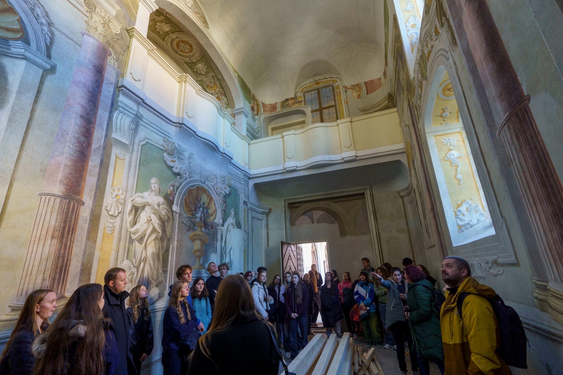 Hned po příjezdu jsme se vydali na okružní procházku Valašským Meziříčím. Role průvodců se ujali naši studenti, kteří si ke každé zastávce připravili poutavý výklad. Nejprve jsme prošli zámeckým parkem a kolem klasicistního zámku Kinských, odkud jsme krásenskou alejí zamířili k někdejší radnici městečka Krásno. Dnes zde sídlí centrum her a poznání Vrtule, které jsme si s chutí prohlédli a vůbec se nám odtud nechtělo. Pokračovali jsme návštěvou kostela Nanebevzetí Panny Marie a renesančně-barokního zámku Žerotínů, kde nás zaujala zámecká kaple i pozůstatky městských hradeb.