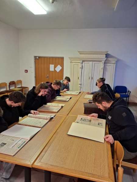 Provedl nás pan Mgr. Pomlka, ukázal nám depozitáře, staré listiny a gruntovní knihy a popovídal, v čem spočívá práce historika. Studenti mohli i „zabádat“, přečíst si zprávy z dobového tisku a kriticky je vyhodnotit.